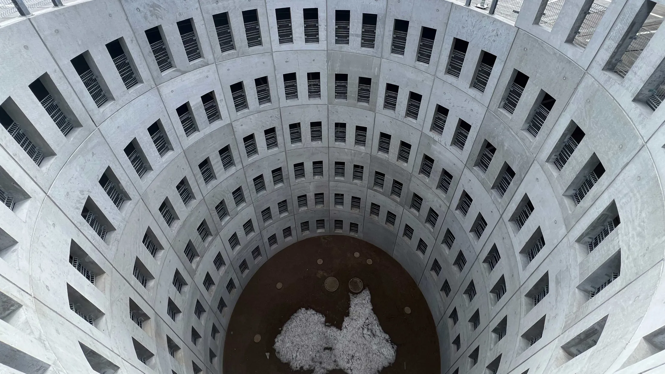 Parkeringsdækkene er udformet som en sammenhængende spiral omkring et centralt gårdrum. Etagedækket stiger jævnt og fungerer både som parkeringsareal og som adgangsvej mellem etagerne.