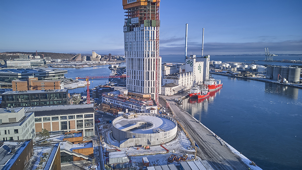 Kun 2 etager er synlige over terræn, mens fire af parkeringshusets seks etager er placeret under havoverfladen. Resten er placeret under jorden, hvilket bidrager til at bevare udsyn, lysforhold og sammenhængen mellem bygningerne i området.