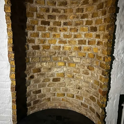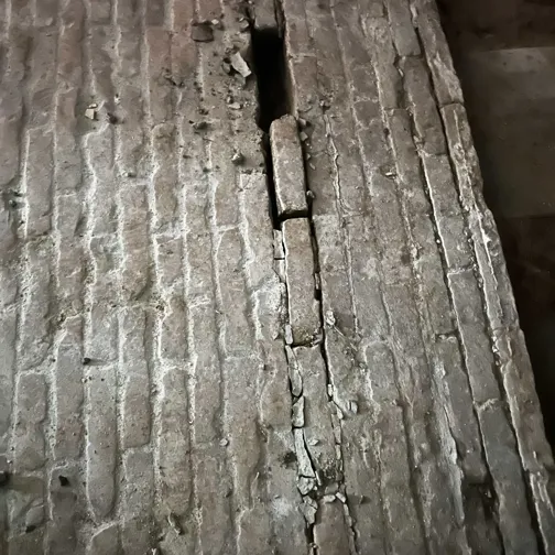 I kælderen repareres det oprindelige gulv, som er lagt i Flensborgsten. Hvor stenene er beskadigede eller mangler, suppleres der med genbrugssten, så udtrykket og materialekarakteren bevares. Arbejdet udføres med respekt for det eksisterende gulvs opbygning og struktur.
