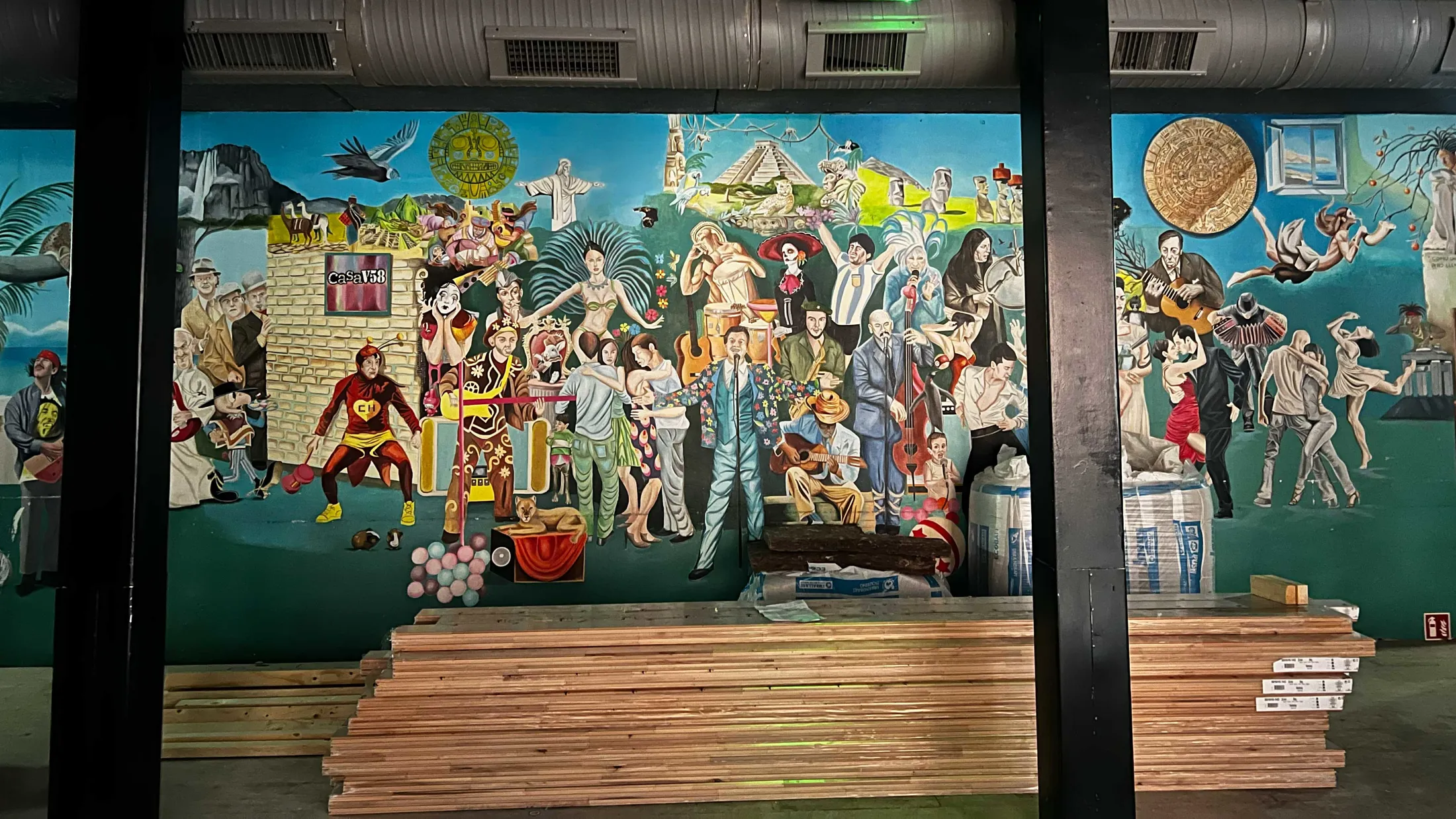 Den tidligere koncertsal er bygningens centrale rum. Søjlerne skaber rytme i rummet, og vægmaleriet bevares som en del af stedets historie.