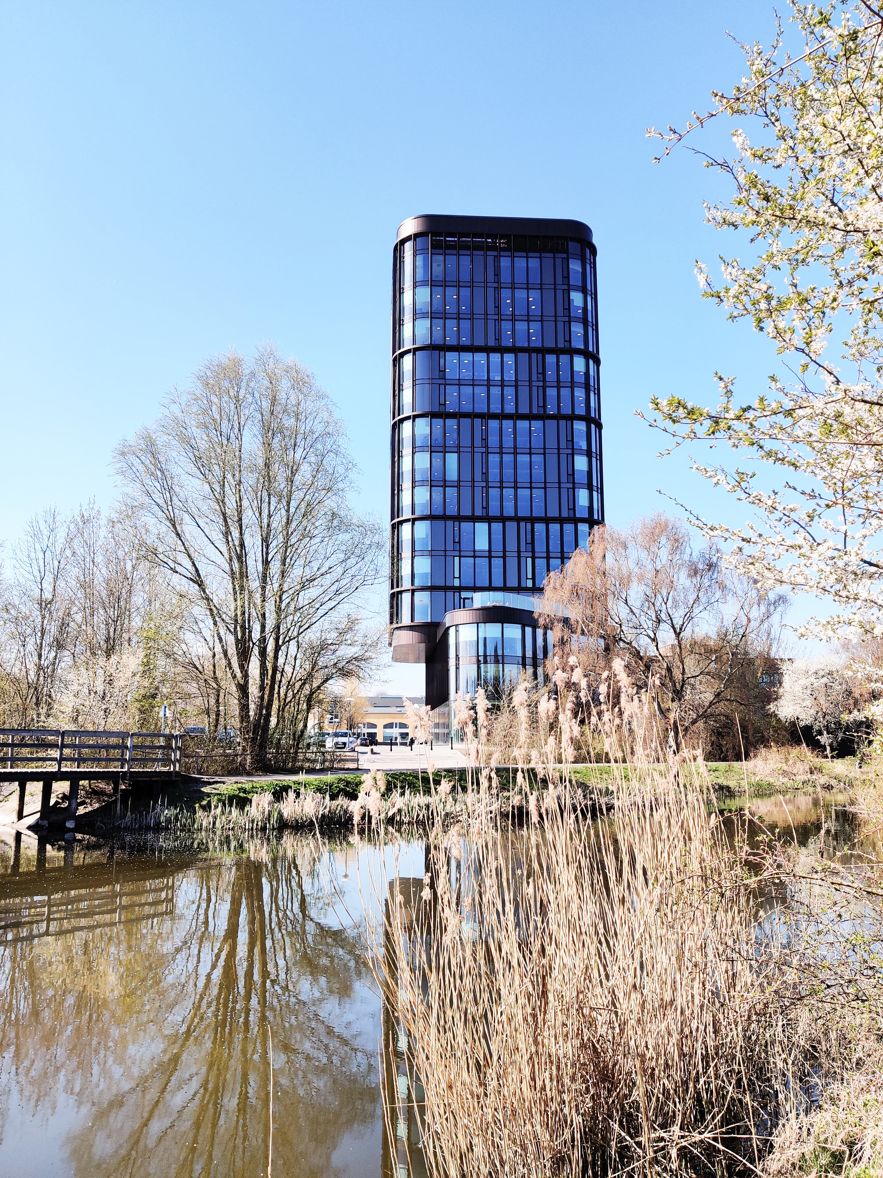 ”Målet var et tårn, som falder diskret ind i omgivelserne. De runde hjørner blødgør formen, så det ikke står for skarpt i forhold til den eksisterende bygning og naturen omkring.” Jan Olesen, arkitekt Ejendomsselskabet Olav de Linde A/S