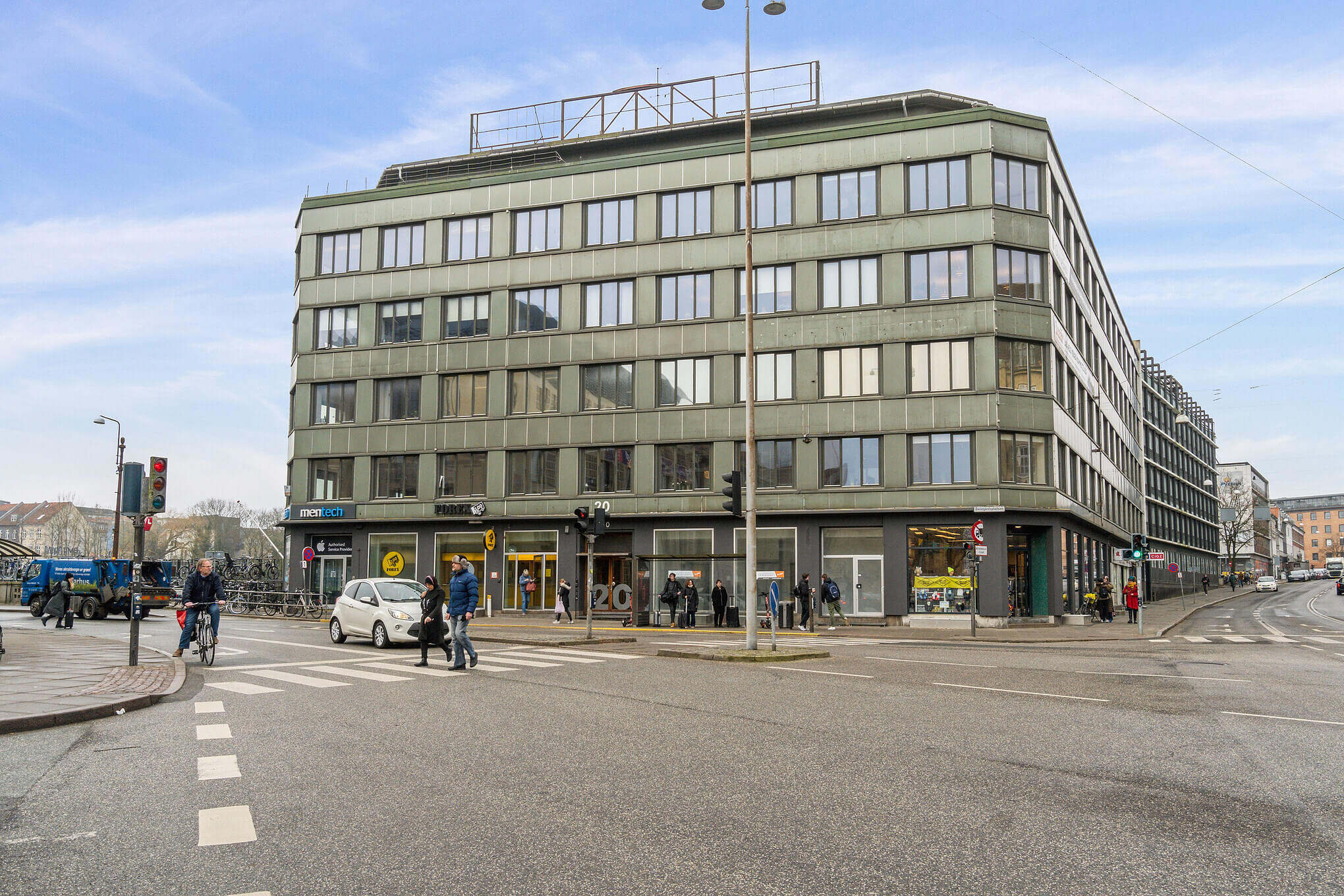 Den markante hjørneplacering åbner sig mod pladsen og lader dagslyset strømme ind gennem de store vinduer. Herfra er der udsigt til byens liv – fodgængere, cyklister og letbanen, der bevæger sig forbi. Ejendommen indgår som en naturlig del af byens puls og har gjort det i generationer.