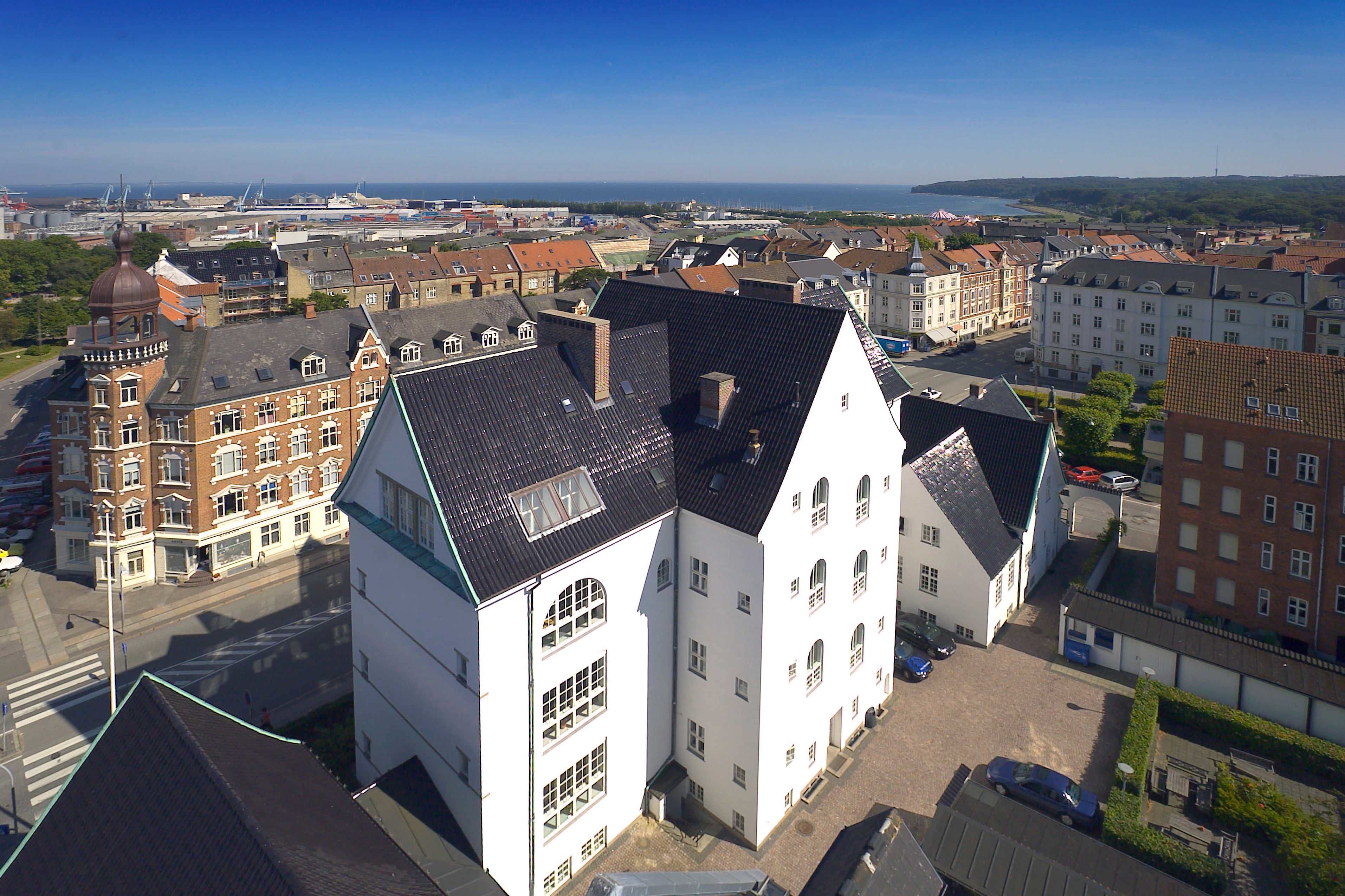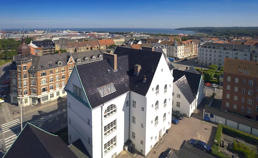 Tidligere købmandsskole fra 1905 på Frederiksbjerg i Aarhus C, i dag indrettet til kontor. Tegnet af Hack Kampmann med de oprindelige rum bevaret.