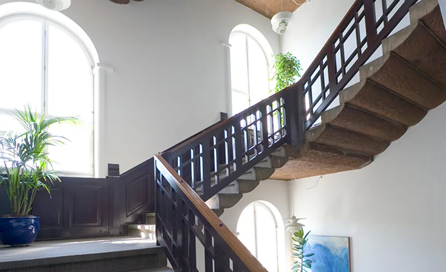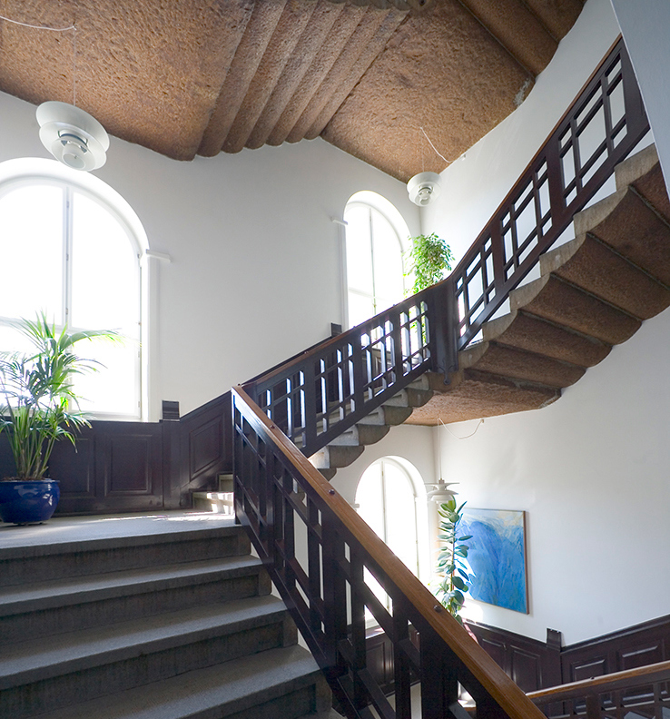 Trapperummet er bygningens samlende element. Det ligger centralt og forbinder etagerne med åbninger, der giver udsyn på tværs. Buede åbninger, søjler og trægelændere med gennemgående detaljer præger rummet, og høje vinduer lader lyset falde ind langs trappen og videre ud i bygningen.