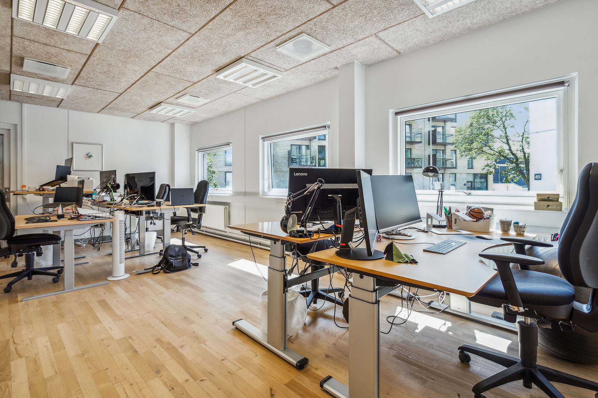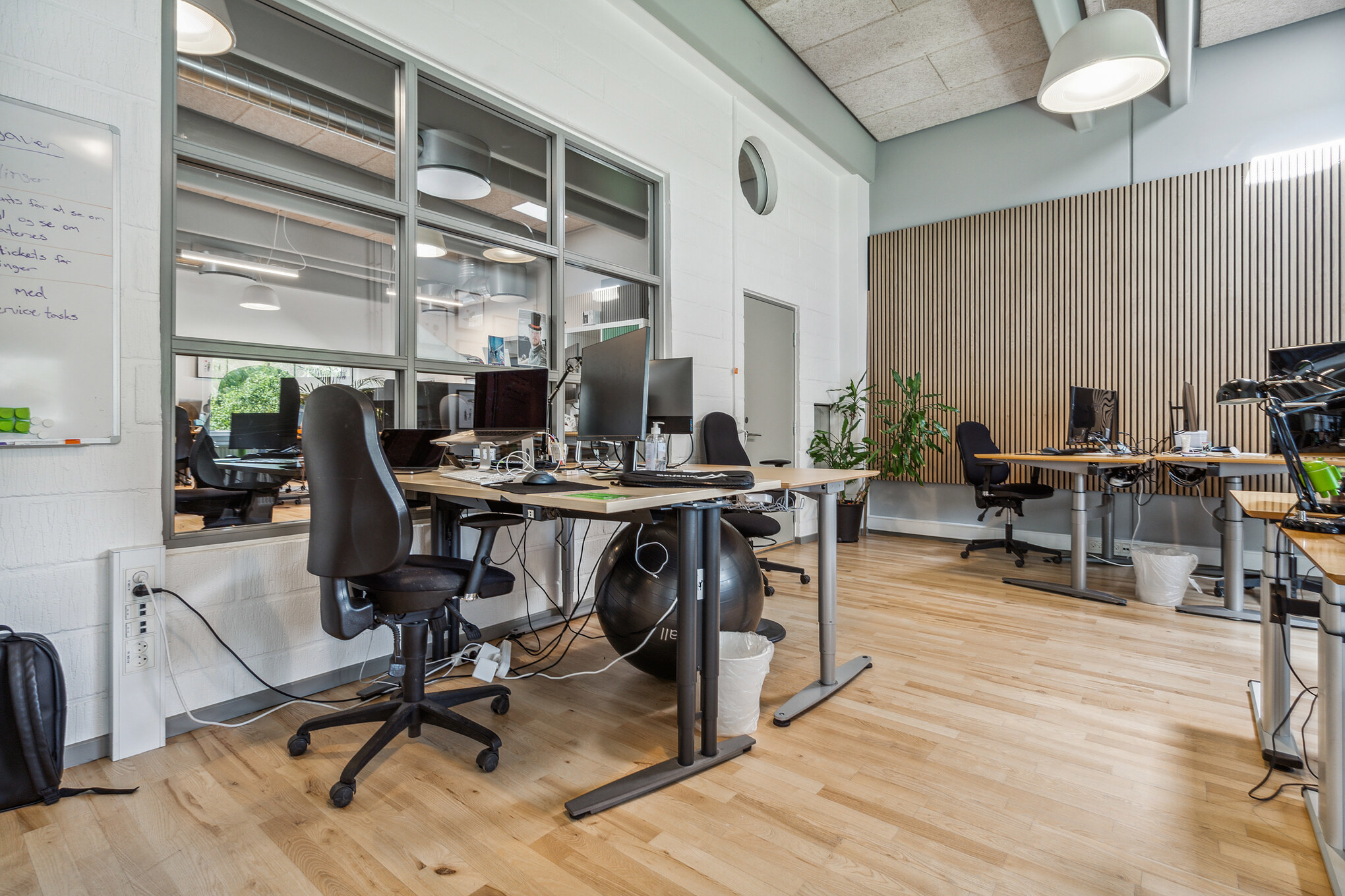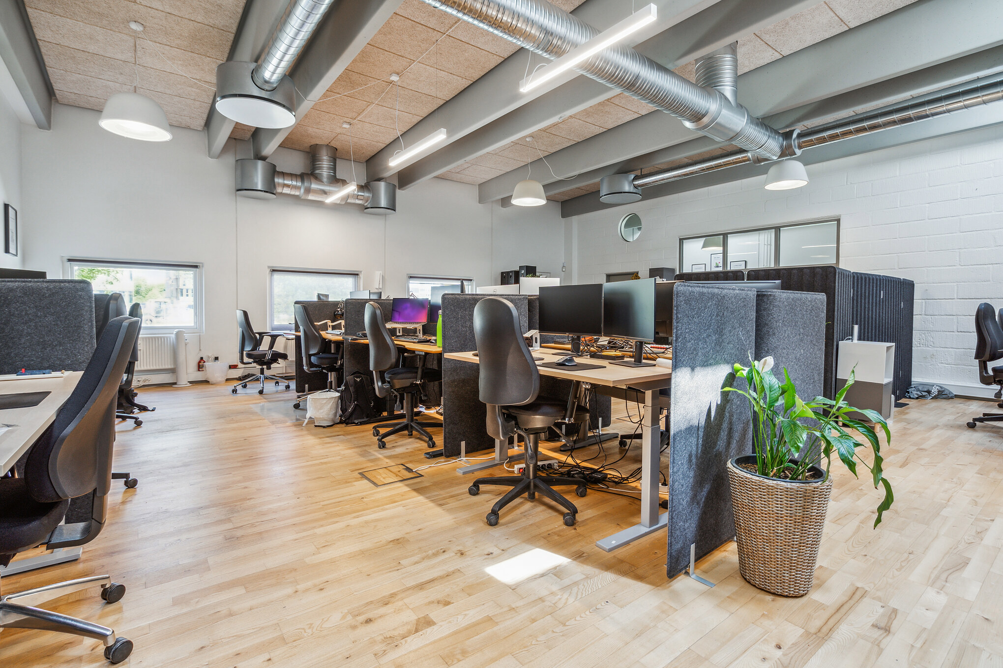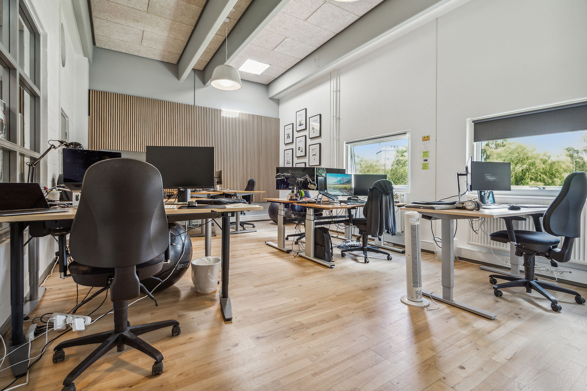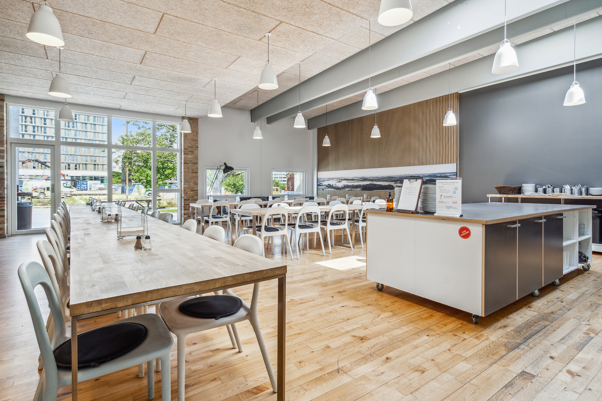 Derudover indeholder ejendommen også kontorer og mødelokaler, og overalt sættes øjnene på opdagelse, for her er ikke sparet på de skæve detaljer. Blandt andet med et væld af rå murstensvægge i genbrugsmursten og industrielle rumdelere af høje vinduespartier fra Ejendomsselskabet Olav de Lindes lager, hvor byggematerialer fra tidligere forandringsprojekter gemmes og genbruges i andre projekter som dette.