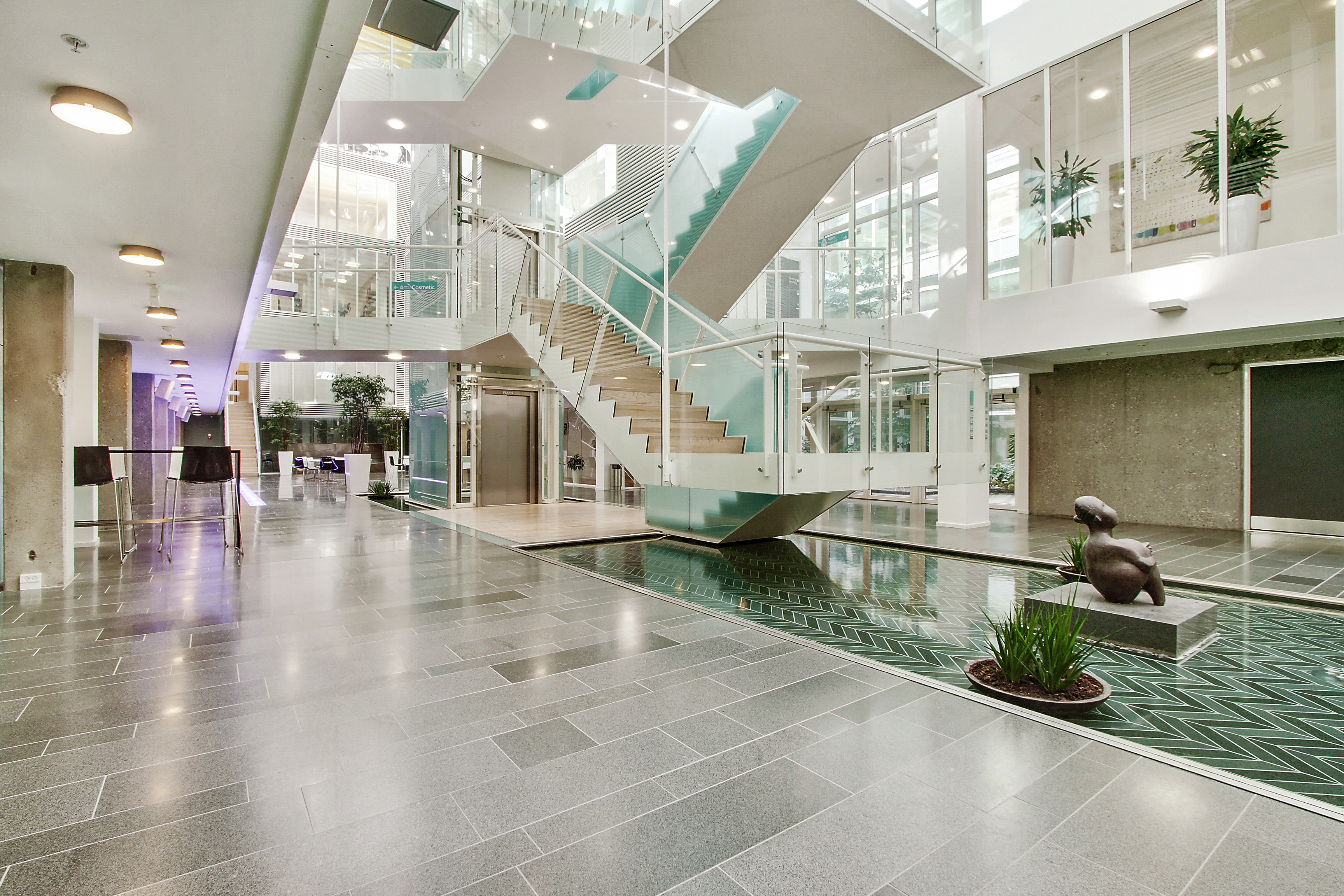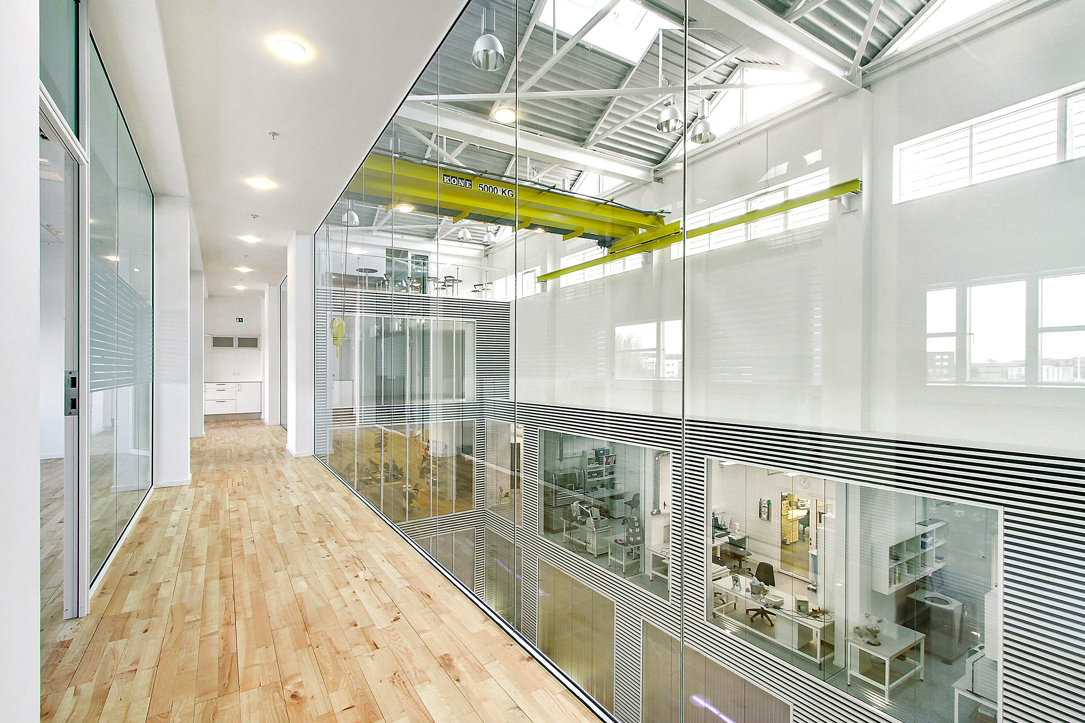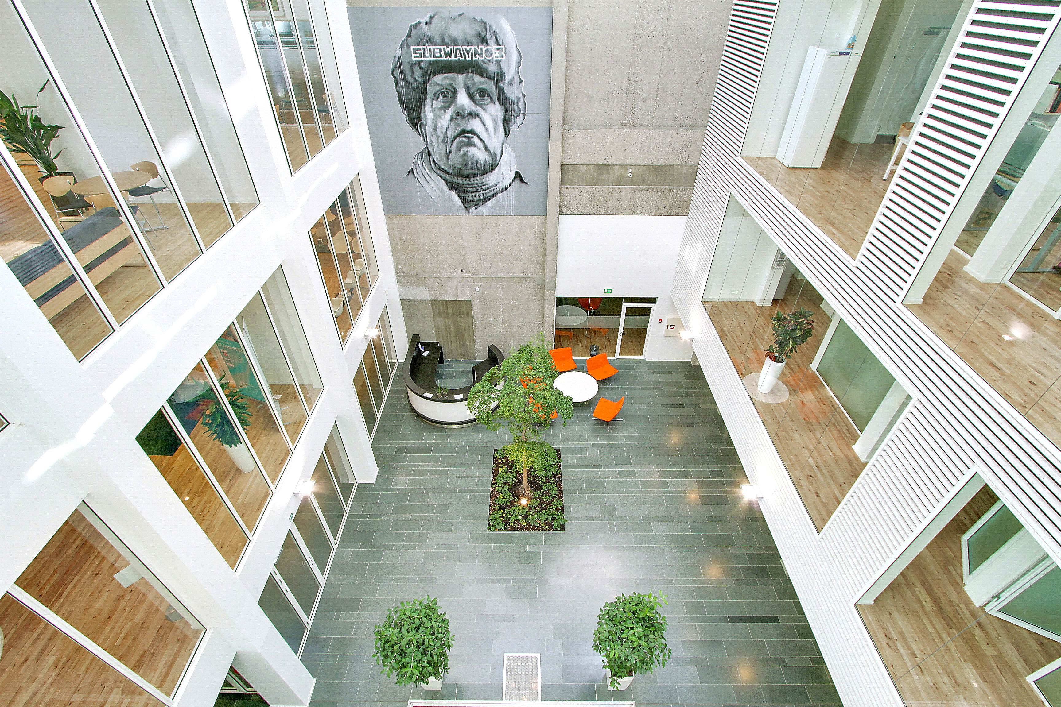 Hvert lejemål har adgang til bygningens hjerte: et indendørs gårdrum med et lyst og luftigt atriummiljø fra de høje vinduespartier. Her er der rig mulighed for at lade øjnene vandre, da der desuden er udsigt til velbevarede detaljer fra hallens fortid som trykkeri, herunder en gul traverskran, som er renoveret og bevaret cirka 18 meter oppe under hallens loft.