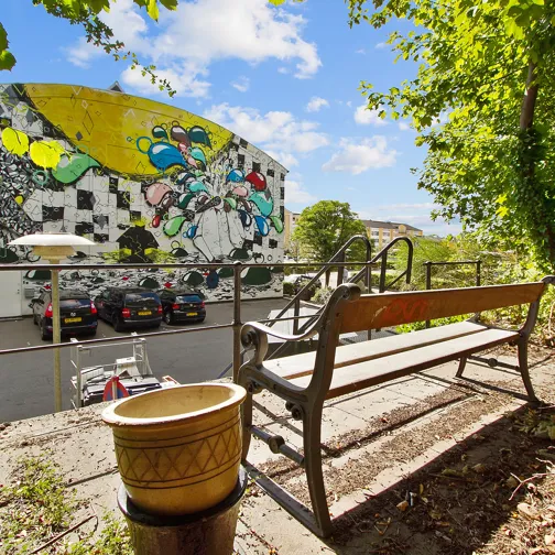 Samtidig ændrede området udtryk og funktion. Facader blev åbnet med nye vinduespartier og indgange, parkeringsarealer blev integreret i helheden, og grønne elementer som træer, hække og gårdrum blev en naturlig del af opholdsmiljøet. Kunst, street art, PH-lamper og vandkunst fandt gradvist vej ind i området.