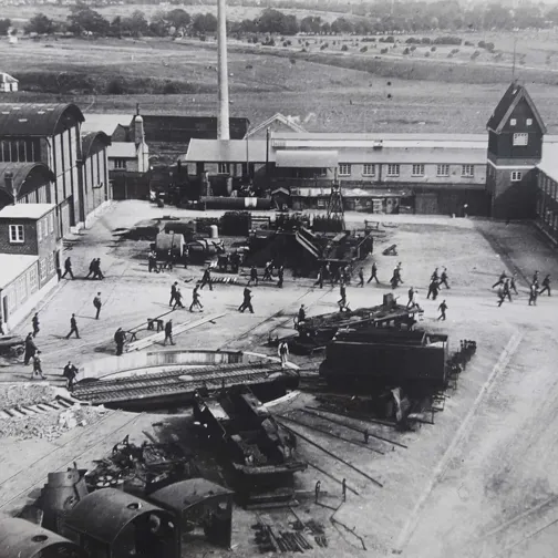 Sort-hvide fotografier fra begyndelsen af 1900-tallet fortæller en anden historie. Her lå Frichs Fabrikker, hvor tunge togdele blev samlet til færdige lokomotiver og togvogne. Produktionshallerne rummede støberi, grovsmedje, lokomotivværksted og modellager, mens administrationsbygning, mesterstue, frokostrum og badefaciliteter understøttede hverdagen for svende, lærlinge og funktionærer.