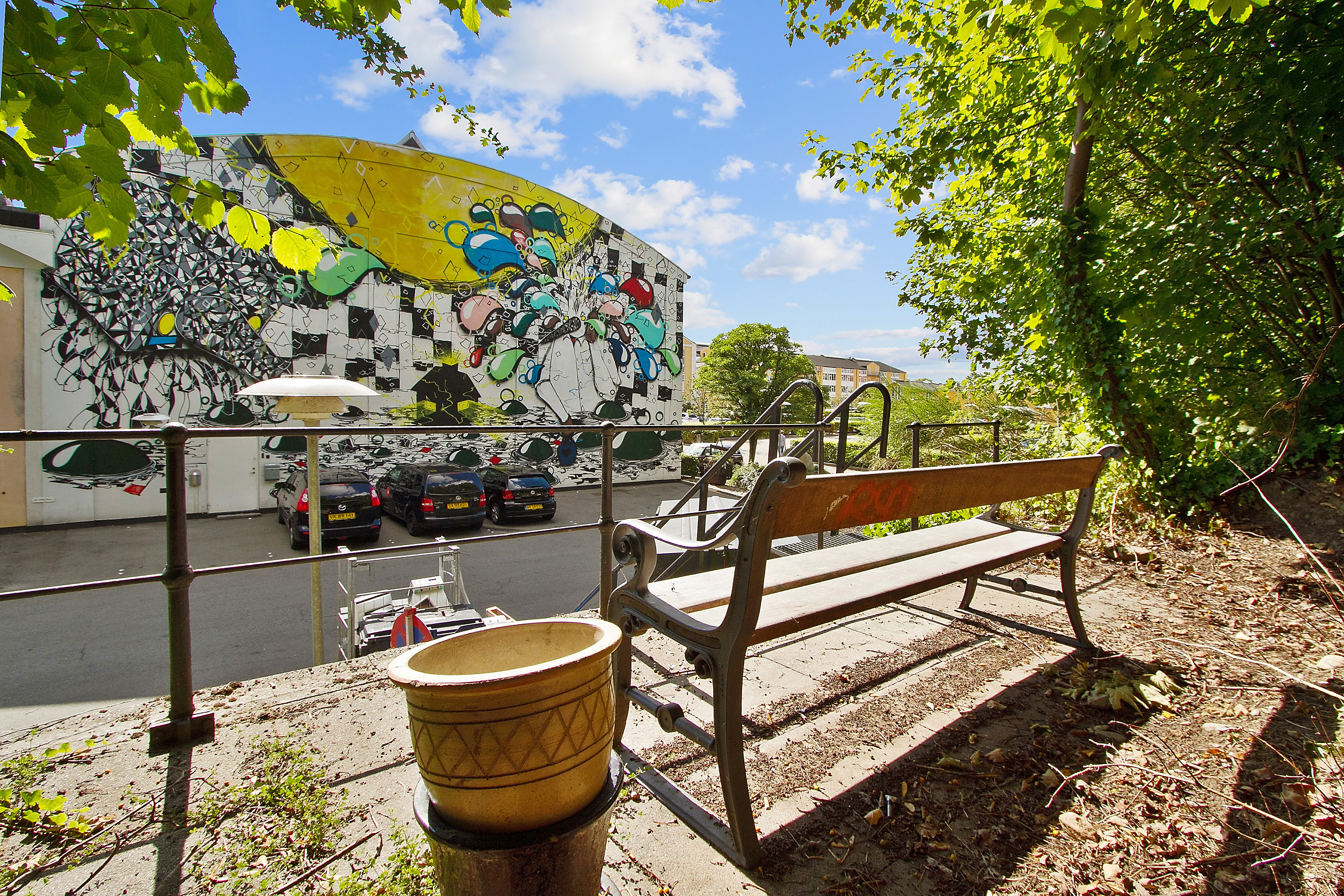 Samtidig ændrede området udtryk og funktion. Facader blev åbnet med nye vinduespartier og indgange, parkeringsarealer blev integreret i helheden, og grønne elementer som træer, hække og gårdrum blev en naturlig del af opholdsmiljøet. Kunst, street art, PH-lamper og vandkunst fandt gradvist vej ind i området.