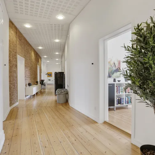 Ejendommens særlige atmosfære mærkes tydeligt i de buede fordelingsgange på de tre midterste etager. Afrensede murstensvægge, sprossede vinduer og oprindelige dørkarme skaber et roligt, men levende forløb gennem bygningen. Også bagtrappen bidrager til helhedsoplevelsen – et cirkulært rum, hvor gelænderets bevægelse trækker blikket med sig gennem etagerne.