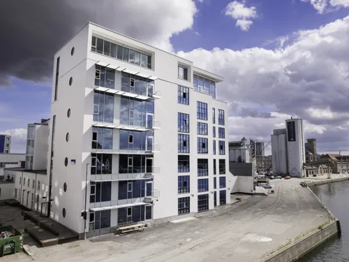 Flere ejendomme på Odense Havn indrettet til kontorer og erhverv i tidligere siloer, pakhuse og kornlagre med bevaret industrielt udtryk tæt på bymidten.