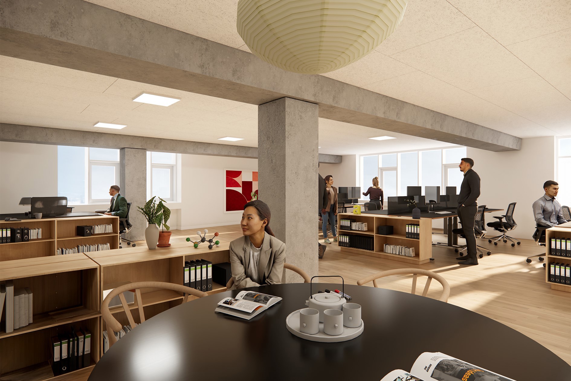 Lejemålet strækker sig over to plan og opleves som en sammenhængende helhed, hvor åbne forbindelser mellem etagerne giver en naturlig flow og understøtter samarbejde på tværs af organisationen. Indretningen er fleksibel og imødekommer både behovet for åbne kontorlandskaber, effektive mødefaciliteter og mere afskærmede arbejdszoner, hvor fordybelse og ro kan finde sted.