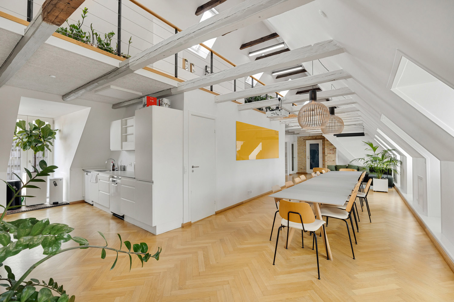 Lejemålets indretning er en god kombinationen af store vinduespartier, åbne rum, industrielle elementer og et godt lysindfald.