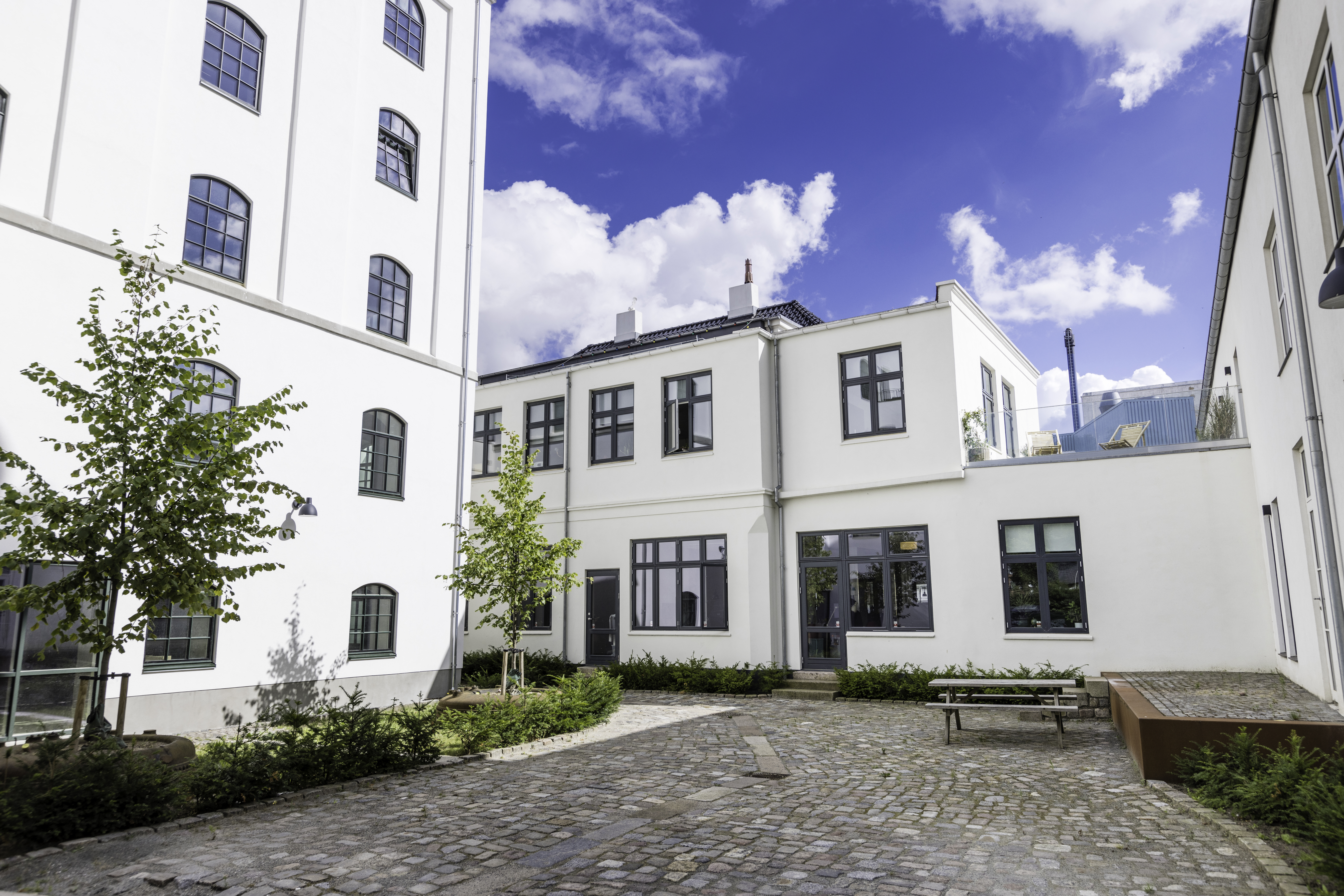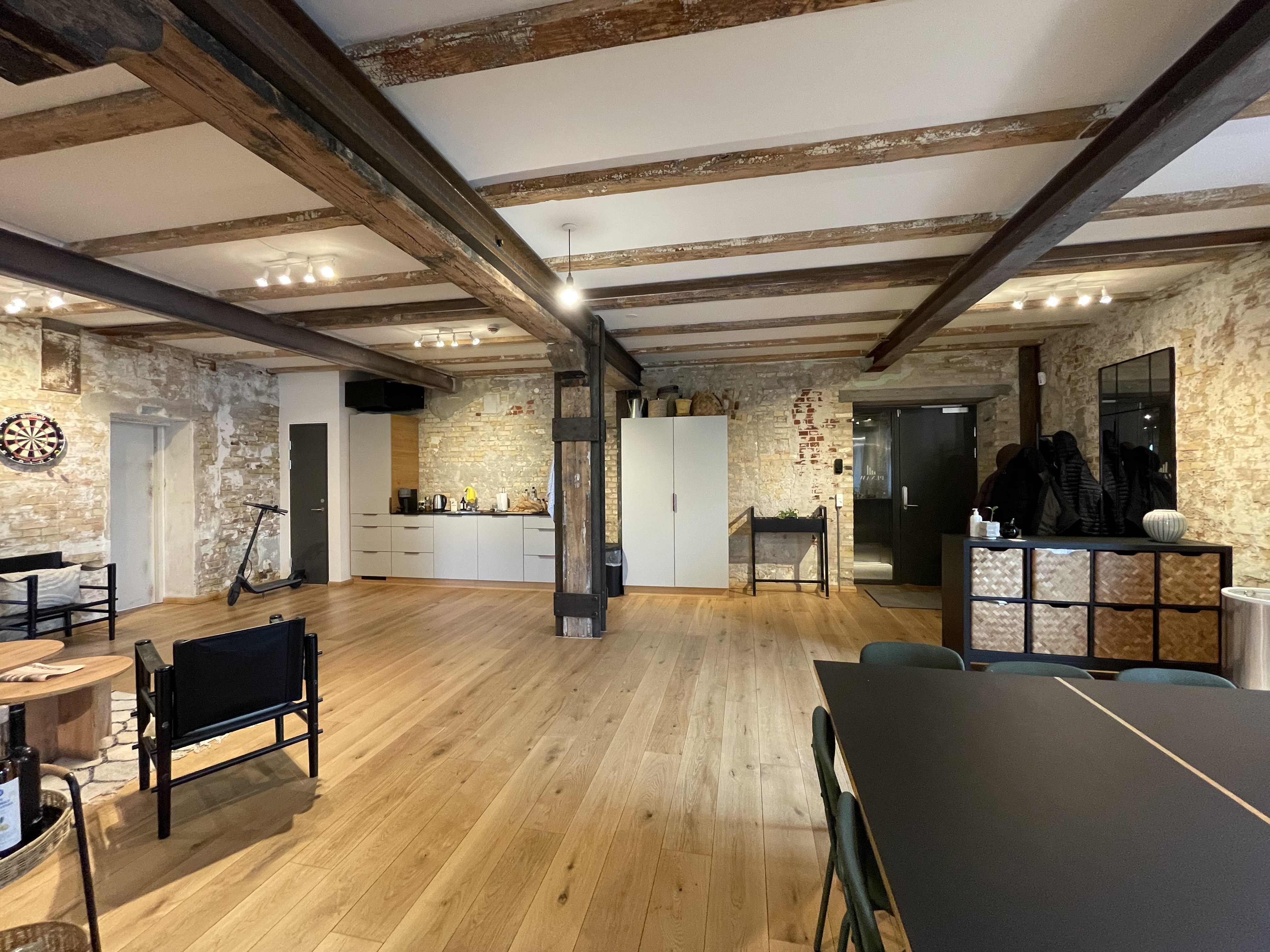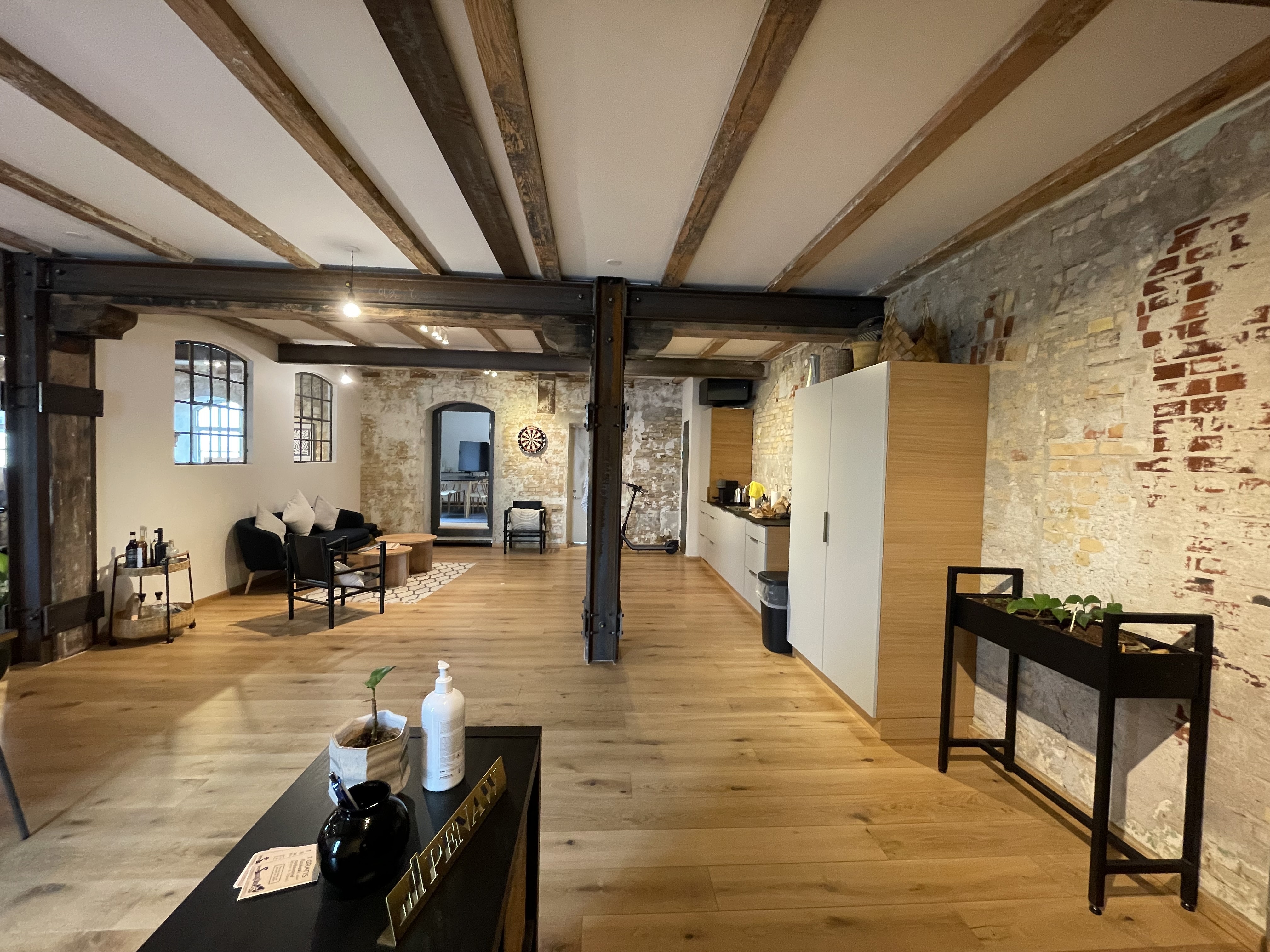 Du træder ind i et kontor, hvor historien stadig er til stede i materialer og detaljer. De synlige bjælker, rå murstensvægge og robuste søjler giver rummet en særlig tyngde, som står i fin kontrast til de lyse gulve og det åbne udtryk.