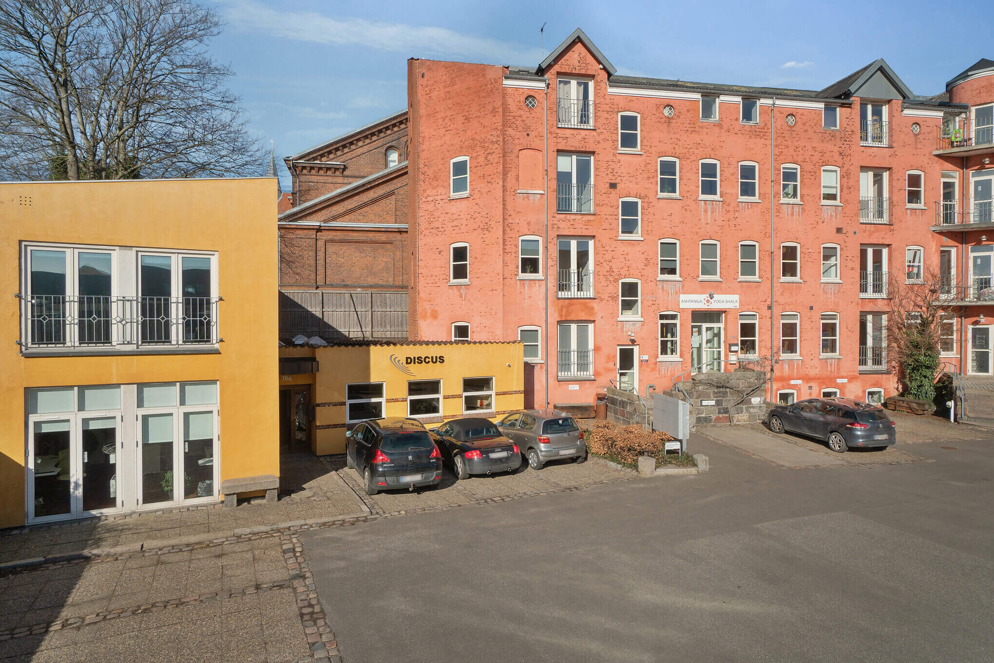 Fra din hoveddør har du et væld af caféer og butikker tæt på, ligesom du er få hundrede meter fra centrum og Åen. Bygningen huser også driftige virksomheder med forskellige kontorlejemål, hvilket giver et hyggeligt liv i den lille baggård her bagved Nørre Allé.