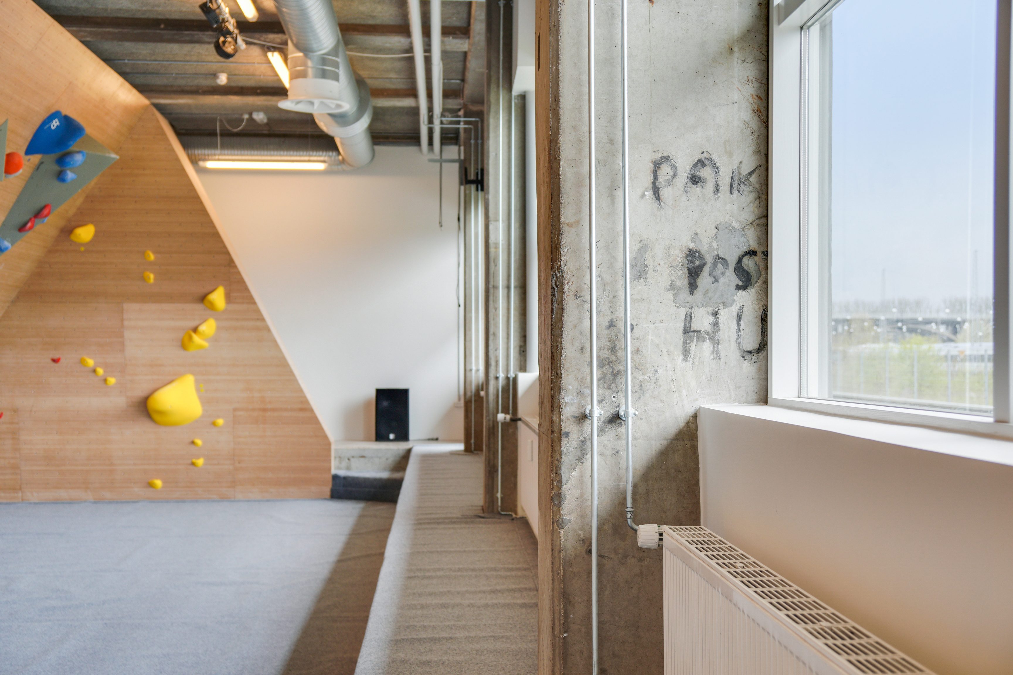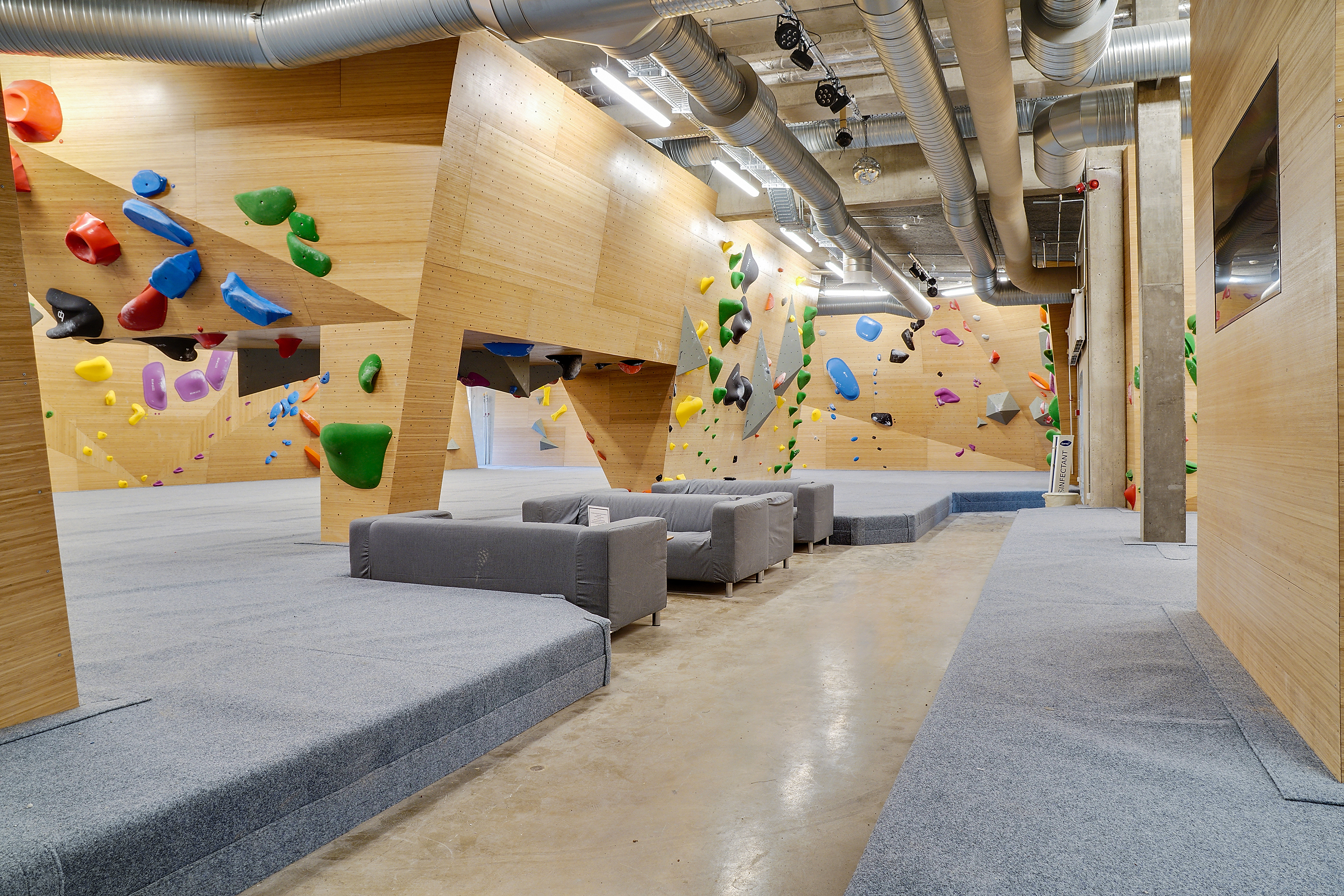 Aarhus Boulders har indrettet sig i bygningens østligste del med en ny klatreafdeling. Her tårner specialbyggede klatrevægge op i et væld af formationer.