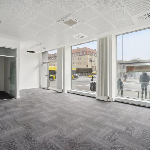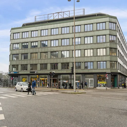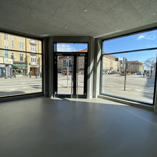 Den markante hjørneplacering åbner sig mod pladsen og lader dagslyset strømme ind gennem de store vinduer. Herfra er der udsigt til byens liv – fodgængere, cyklister og letbanen, der bevæger sig forbi. Ejendommen indgår som en naturlig del af byens puls og har gjort det i generationer.