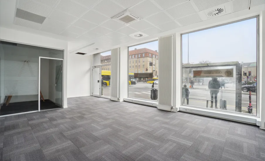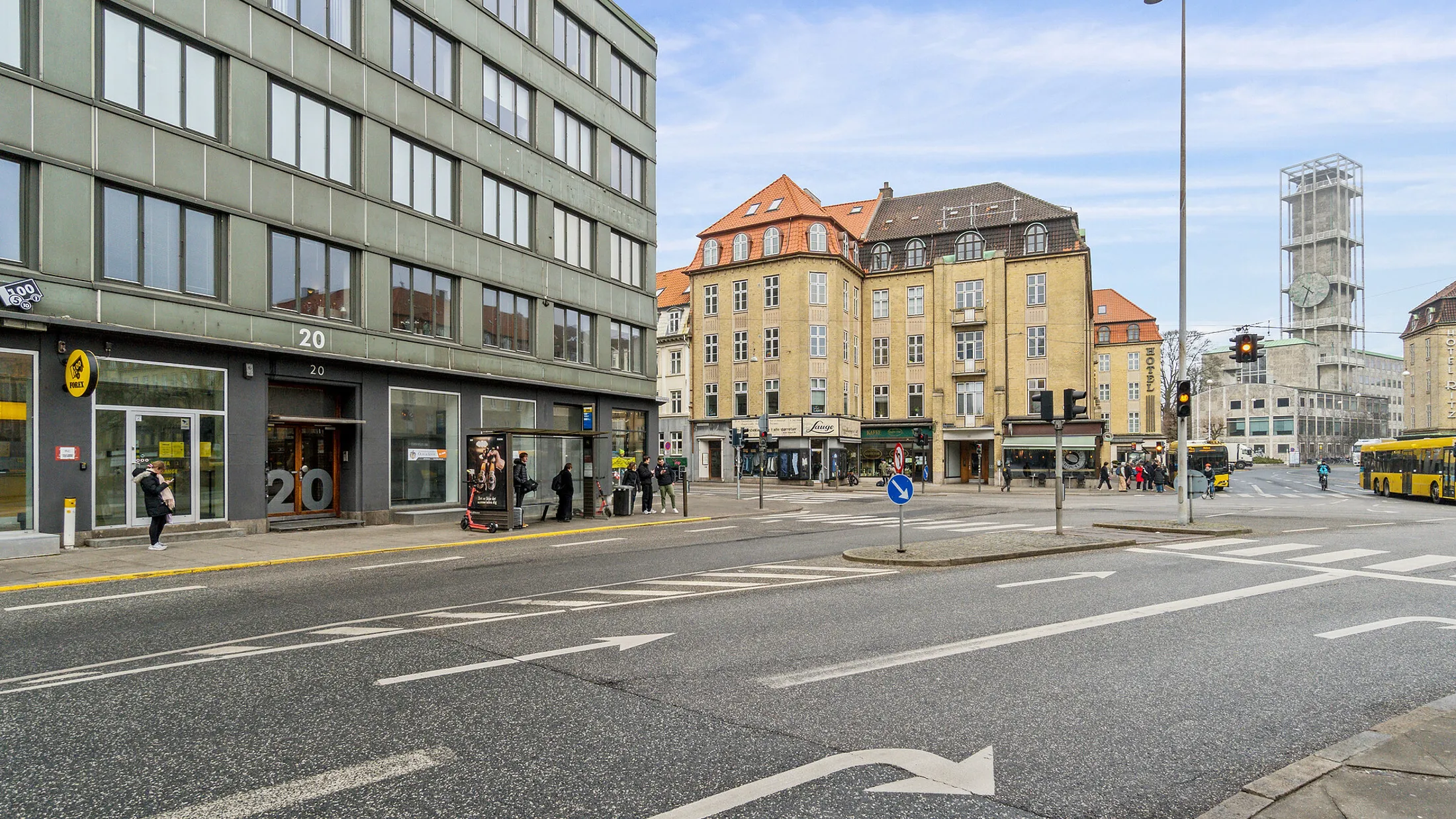 Stueetagen rummer erhvervslejemål med indgange direkte fra fortovet langs både Banegårdspladsen og Banegårdsgade. Hjørneplaceringen giver synlighed fra begge retninger, og lejemålene har facade mod gaden med vinduer og adgang direkte fra gadeplan.