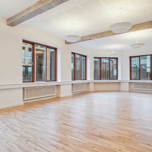 Vinduerne ligger i vandrette bånd langs etagerne og er ført videre fra den ene facade til den anden. Det understreger bygningens længde langs gaderne og gør hjørnet til et tydeligt punkt i overgangen mellem pladsen og gaden.