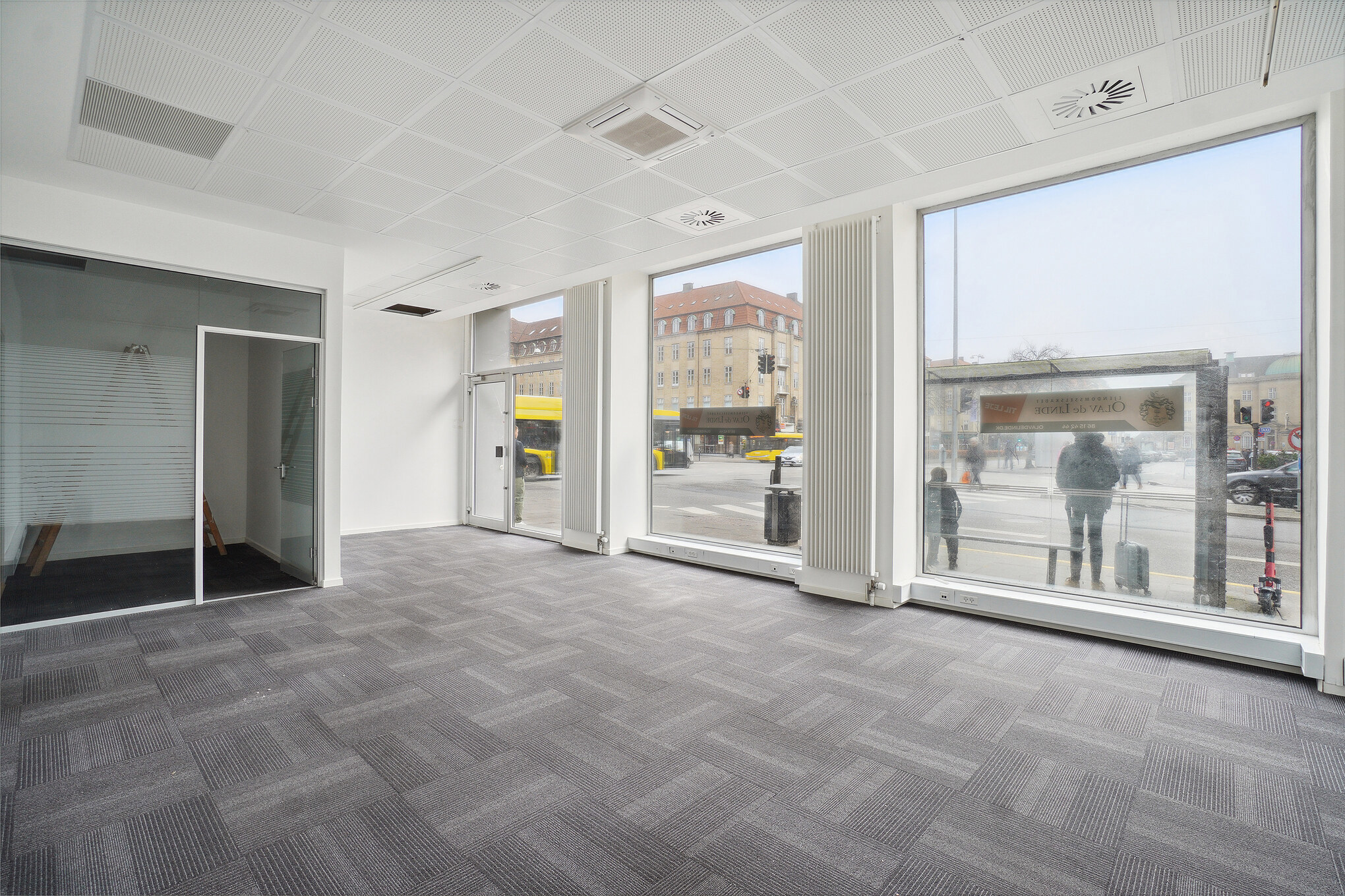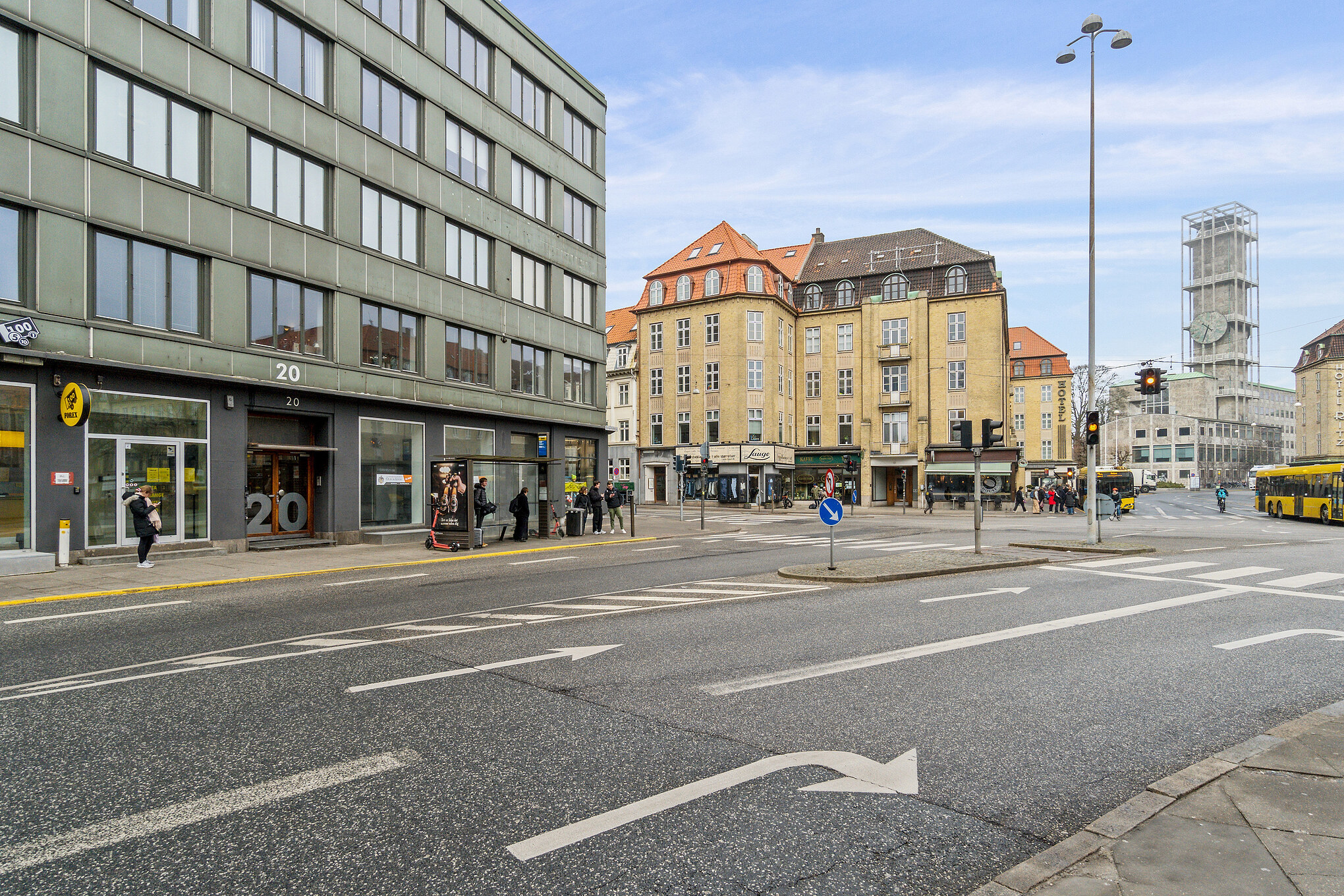 Stueetagen rummer erhvervslejemål med indgange direkte fra fortovet langs både Banegårdspladsen og Banegårdsgade. Hjørneplaceringen giver synlighed fra begge retninger, og lejemålene har facade mod gaden med vinduer og adgang direkte fra gadeplan.