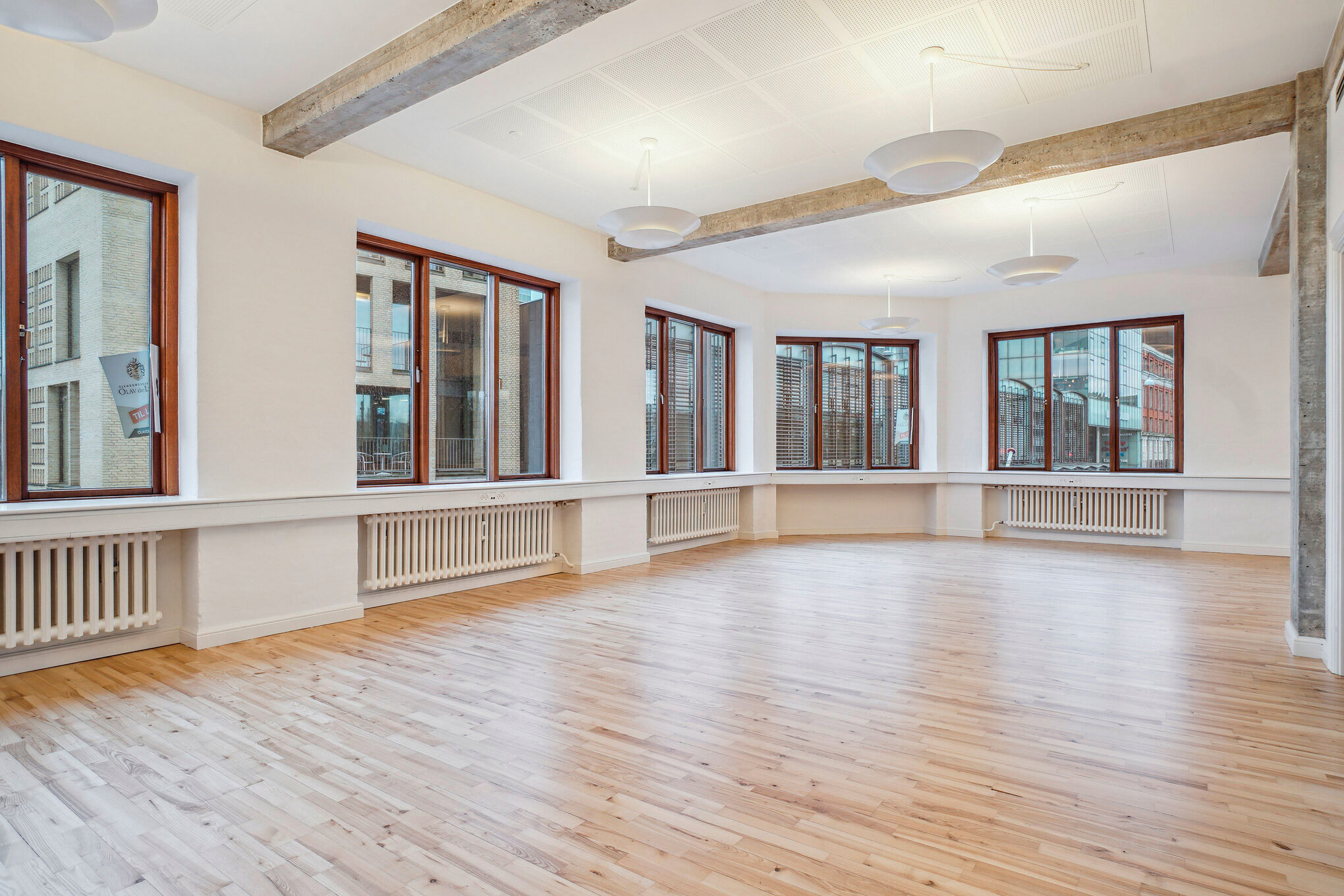 Vinduerne ligger i vandrette bånd langs etagerne og er ført videre fra den ene facade til den anden. Det understreger bygningens længde langs gaderne og gør hjørnet til et tydeligt punkt i overgangen mellem pladsen og gaden.