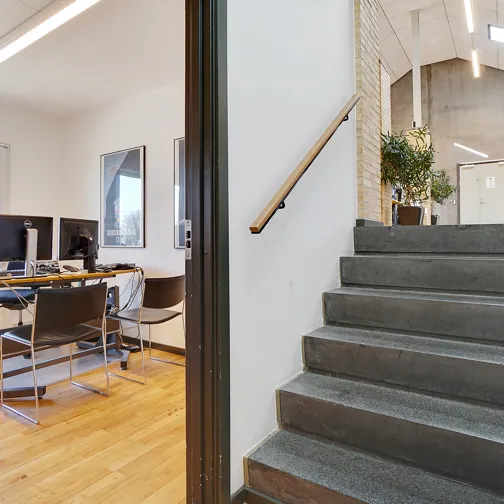 Også ejendommens hovedindgang fortjener et glimt af spotlight, for den er i sig selv en indbydende oplevelse for øjet, når de mørke flader på gulve og vægge forenes med smukke gamle perronbænke på hvert repos. Gennem bygningen skaber forskellige niveauinddelinger og kombinationen af større og mindre kontorer en række spændende brugsmuligheder.