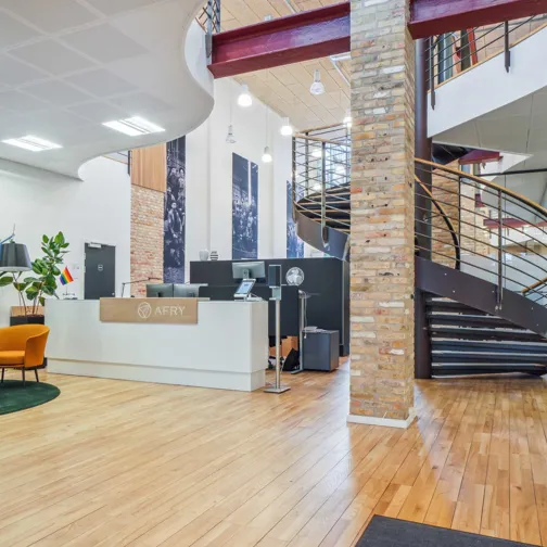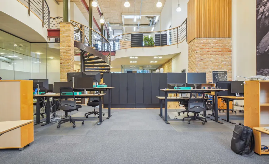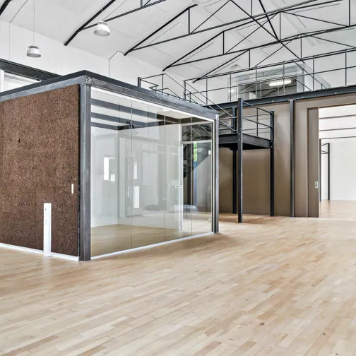 De historiske bygninger er indrettet med respekt for deres oprindelige arkitektur. Synlige konstruktioner, højt til loftet og store vinduespartier giver rummene karakter og gode arbejdsforhold, hvor lys, materialer og proportioner skaber en særlig atmosfære.