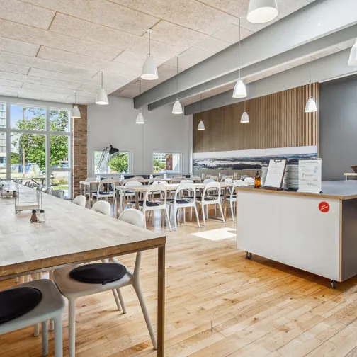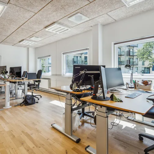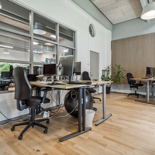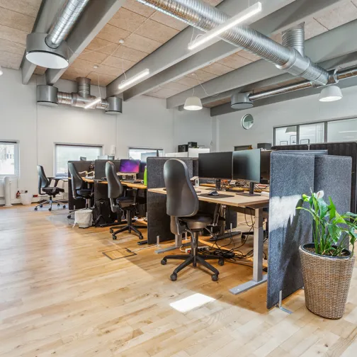 Derudover indeholder ejendommen også kontorer og mødelokaler, og overalt sættes øjnene på opdagelse, for her er ikke sparet på de skæve detaljer. Blandt andet med et væld af rå murstensvægge i genbrugsmursten og industrielle rumdelere af høje vinduespartier fra Ejendomsselskabet Olav de Lindes lager, hvor byggematerialer fra tidligere forandringsprojekter gemmes og genbruges i andre projekter som dette.