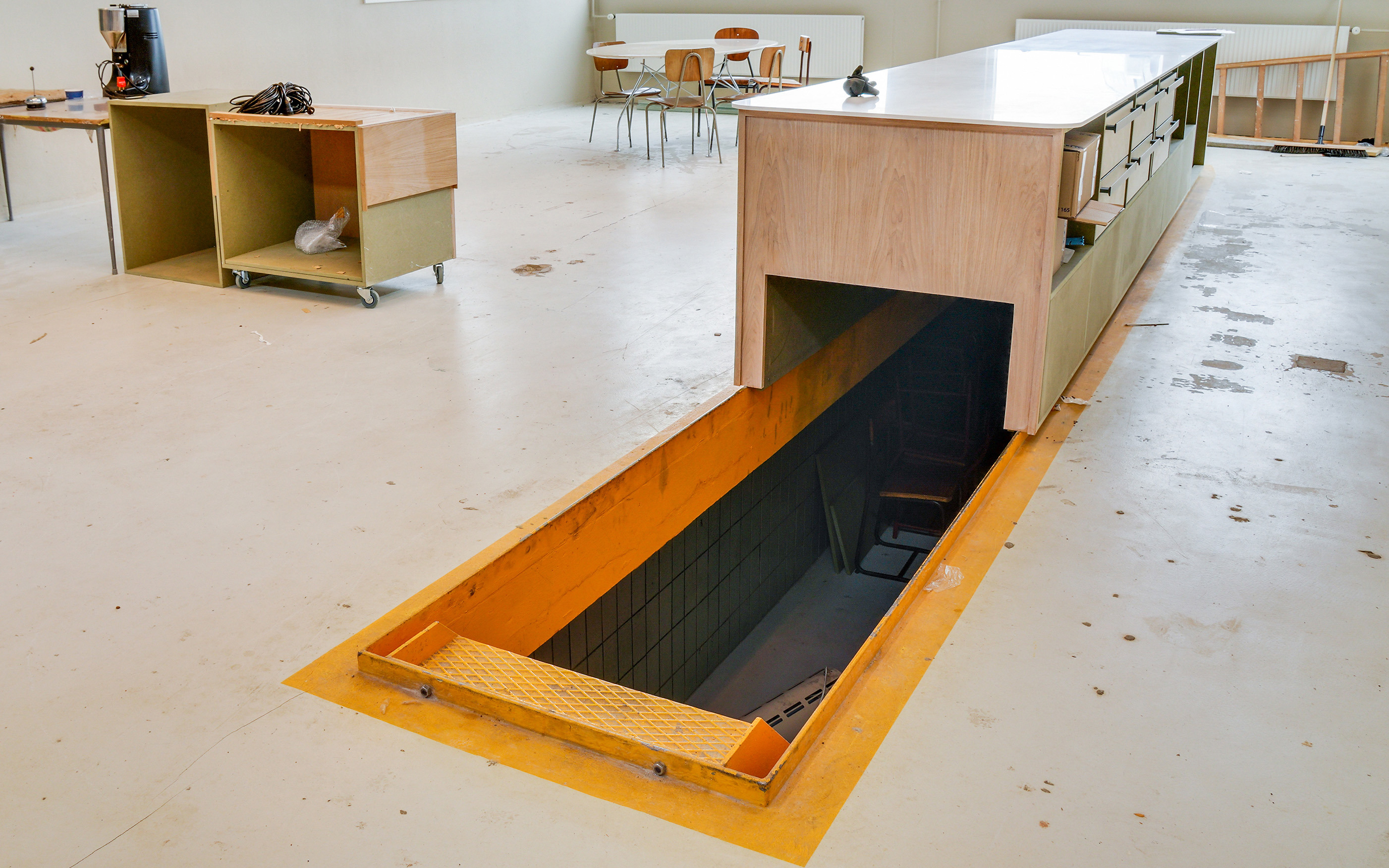 Bygningens originale betonelementer, som lofter, søjler, bjælker og gulve, er bevaret. Det samme gør sig gældende for mest muligt af murværket, de flotte terrazzogulve og døre.