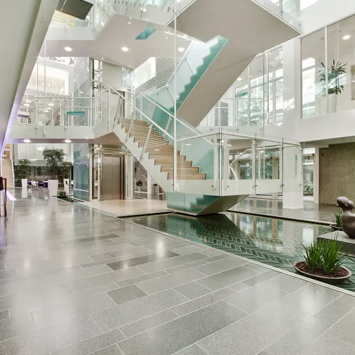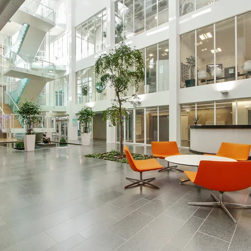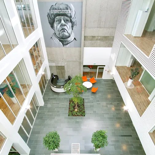 Hvert lejemål har adgang til bygningens hjerte: et indendørs gårdrum med et lyst og luftigt atriummiljø fra de høje vinduespartier. Her er der rig mulighed for at lade øjnene vandre, da der desuden er udsigt til velbevarede detaljer fra hallens fortid som trykkeri, herunder en gul traverskran, som er renoveret og bevaret cirka 18 meter oppe under hallens loft.